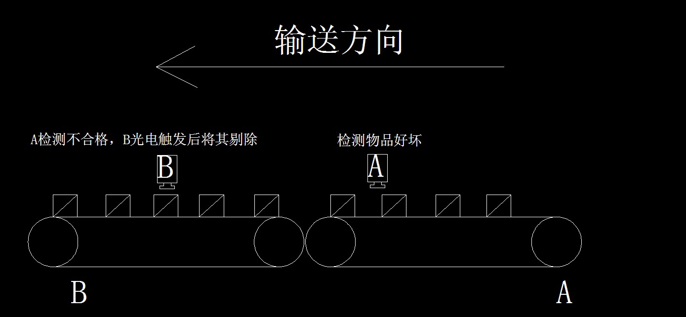 此有輸送帶A和B很好的銜接在一起,物料一批一批按方向進(jìn)來(lái),A是視覺傳感器,當(dāng)A檢測(cè)到不合格物品時(shí),此不合格物品觸發(fā)B光電時(shí)被剔除 請(qǐng)問:如何讓B光電準(zhǔn)確的剔除A所檢測(cè)的到不合格物? |