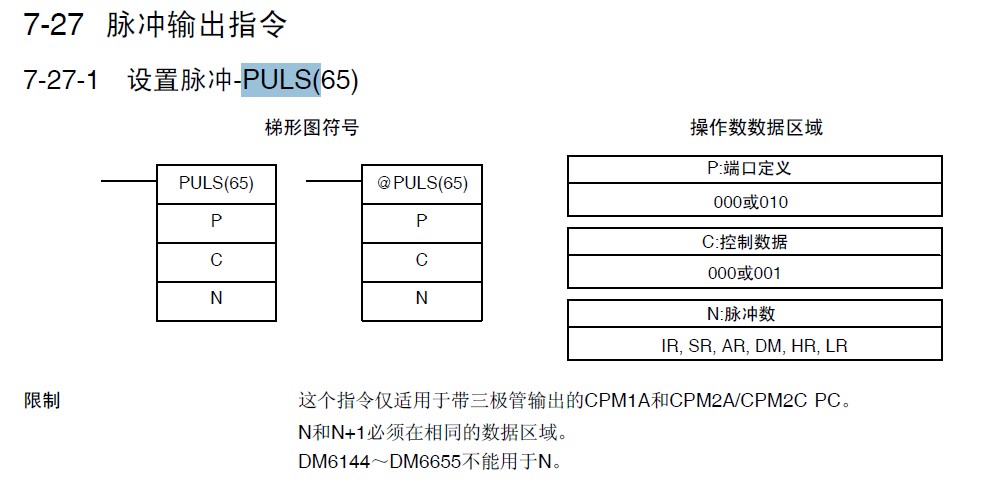 指令的參數(shù)設(shè)置錯(cuò)誤:端口指定符可輸入000或010(僅CPM2A/2C支持);控制數(shù)據(jù)可輸入000或001(僅CPM2A/2C支持);脈沖數(shù)需輸入一個(gè)字地址(占兩個(gè)字),不可輸入常數(shù)。