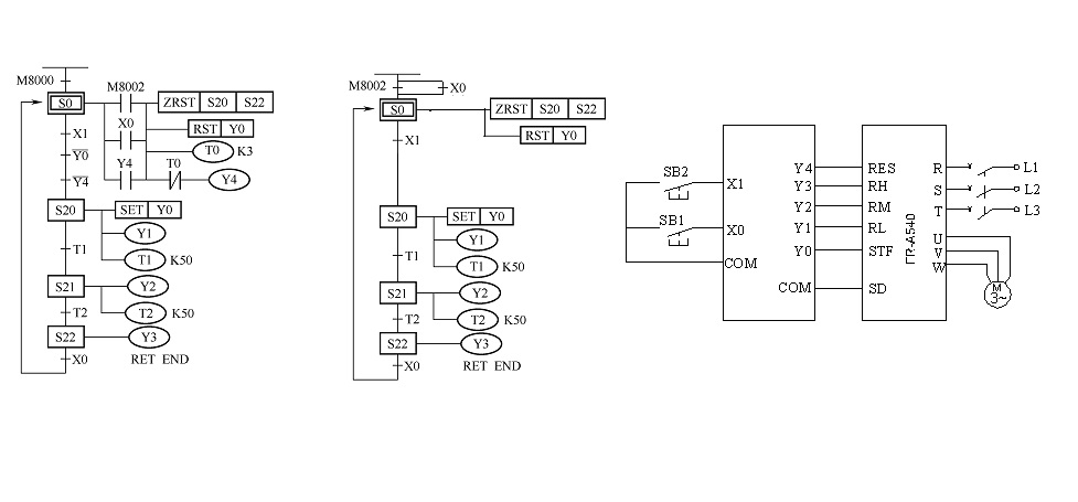 如圖所示,左圖和右圖為資料中用變頻器和PLC對電動機(jī)的多段速控制,其中左圖和右圖是原圖,中間圖是我根據(jù)理解改畫的,但不清楚RES的作用,因此中間圖中沒有畫出來,請高手指教如果不加RES是否行?有何后果?