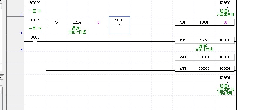 K2600使能高速計(jì)數(shù)器。。。。。因?yàn)橛休斎朊}沖的原因所以輸入并聯(lián)P1的輸入點(diǎn),作用是P1用來檢測1S內(nèi)是否有動(dòng)作。,。!稒C(jī)器運(yùn)料比較慢,所以取1S用來檢測空位》    T1工作說明空位了,空位就把數(shù)據(jù)傳送比較,和復(fù)位高速計(jì)數(shù)器清零等等