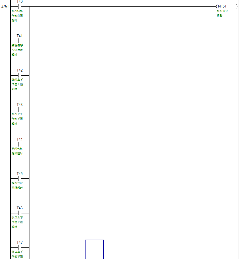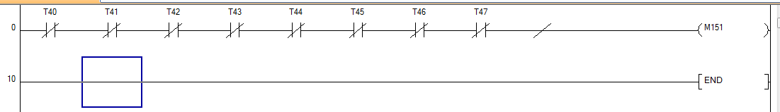 感覺1樓簡化的有問題,樓主的是T40到T47中只要有一個接通,就輸出報警M151,1樓改的是T40到T47中都沒接通時才會輸出M151,T40到T47中只要有一個接通,就不會輸出M151。 |