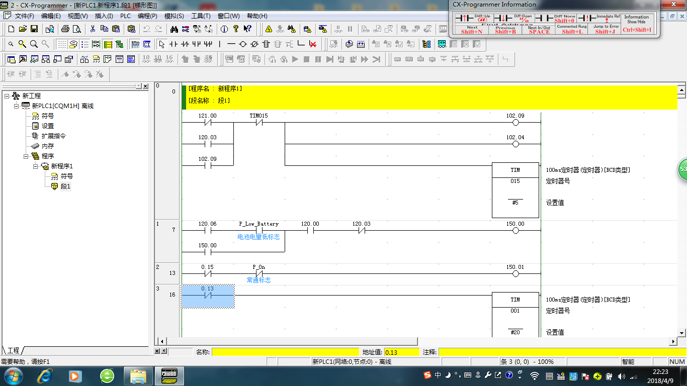 引用引用樓主白云的黃河的于2018-04-09 22:30發(fā)表的 歐姆龍CQM1HCPU21程序問題 :剛開始學plc編程,有些還無法理解,梯形圖里的121.00,120.03,120.06,150.00,150.01這些操作數(shù)是什么意思,怎么理解?求大佬解讀解讀 [attachment=220897]