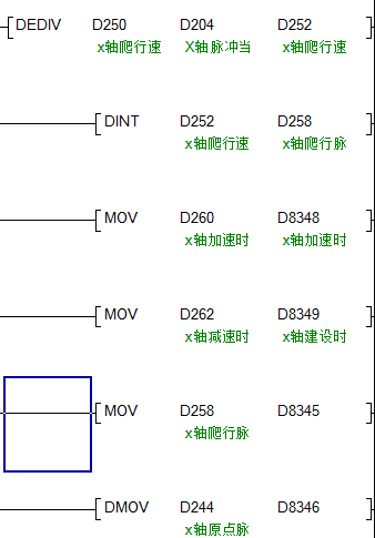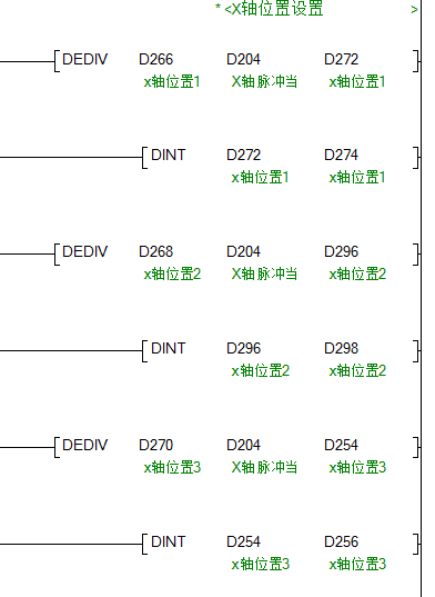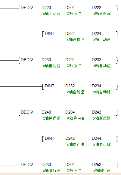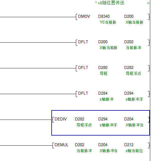 D212是X軸實時位置座標(biāo),D266是X軸某個定位點的位置脈沖數(shù)據(jù), 把軸的運行脈沖數(shù)轉(zhuǎn)換成浮點數(shù)是為了精確位置距離,標(biāo)準(zhǔn)式。。。如果還想不明白就找度娘問問 D200的數(shù)據(jù)是Y0端口脈沖實時計數(shù)值,D280的數(shù)據(jù)是導(dǎo)程,也就是伺服電機或步進電機連接的絲桿的螺距,也就是電機轉(zhuǎn)一圈絲桿行進多少毫米。 樓主留言:明白 先謝謝 |
