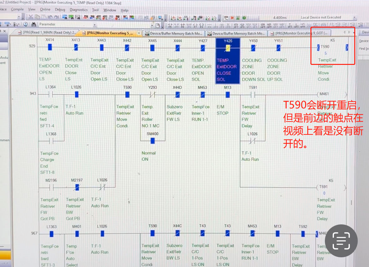 監(jiān)測(cè)時(shí)發(fā)現(xiàn)程序中T590會(huì)自動(dòng)斷開(kāi)重啟,錄視頻放慢看線圈前的觸點(diǎn)沒(méi)有斷開(kāi)的。是因?yàn)橛|點(diǎn)斷開(kāi)的時(shí)間太短嗎?