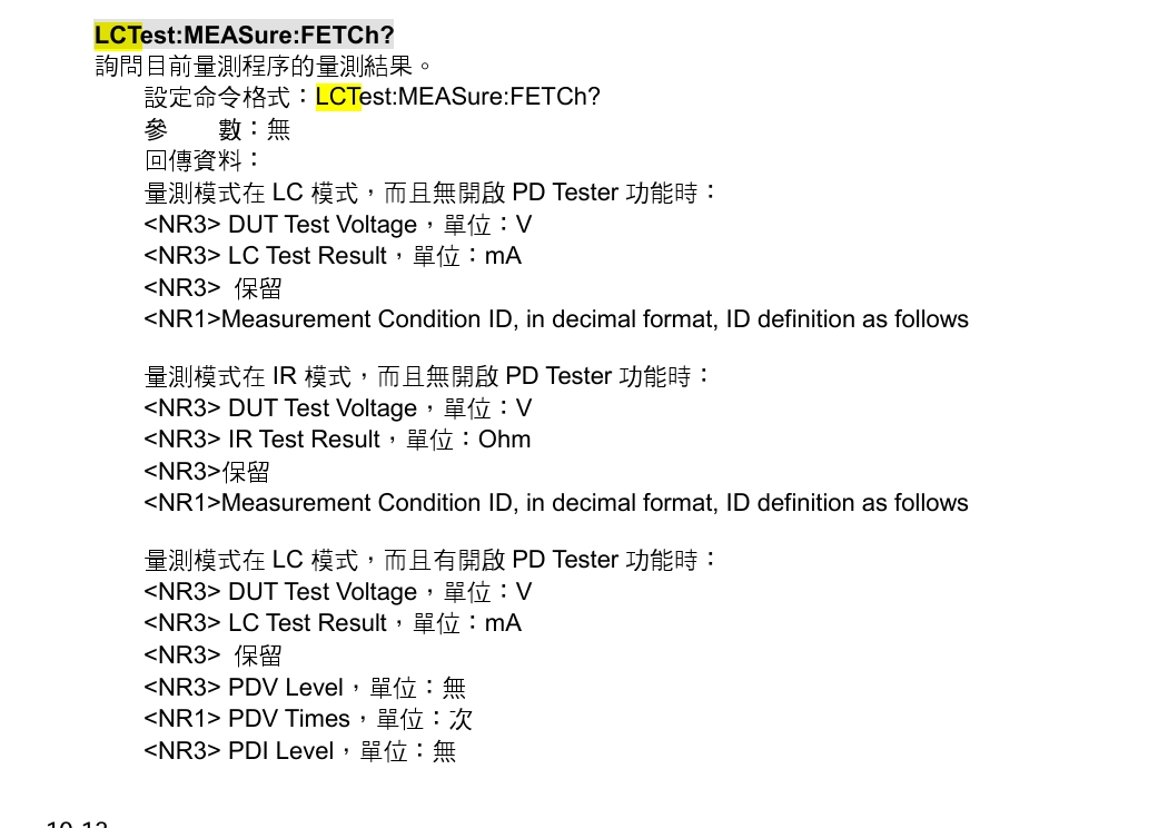 設(shè)定命令格式:LCTest:SOURce:CURRent {<NRf>|MIN|MAX}參數(shù):<NRF>,為0.5~50(mA)可接受 MAX:50mA,MIN:0.5mA回傳資料:<NR2>單位 mA