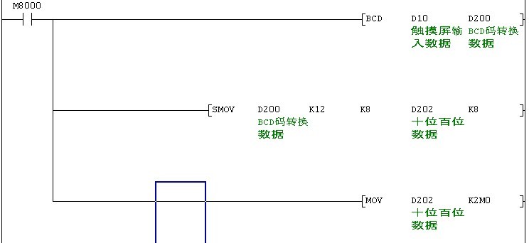 先把觸摸屏過來的數(shù)據(jù)D20用BCD指令轉(zhuǎn)換成BDC嗎 存在D200中,軟后用位移動指令SMOV吧十位 百位移動到D202中,在用MOV指令傳送到M0-M7中