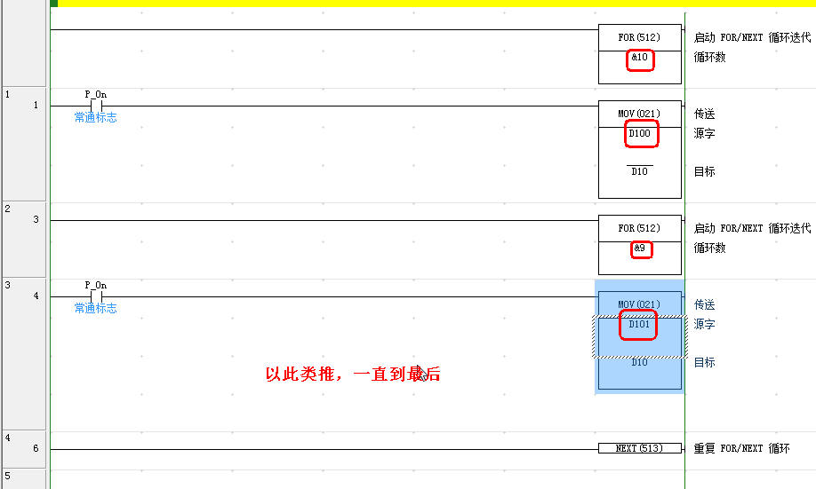 我要寫這樣一段程序:開頭是FOR &10 ,結(jié)尾是NEXT 。這中間程序?yàn)橥瓿蛇@樣一個(gè)功能:執(zhí)行第一次掃描時(shí) MOV D100 D10 ;執(zhí)行第二次掃描時(shí) MOV D101 D10 ;執(zhí)行第三次掃描時(shí) MOV D102 D10 ; …… ;執(zhí)行第十次掃描時(shí) MOV D109 D10 ; 這要怎么寫啊,搞了好久還是寫不出來,智商低了點(diǎn) ![]() |