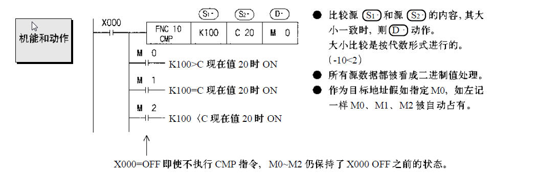 這是一條比較指令,將數(shù)據(jù)寄存器D8018中的內(nèi)容與常數(shù)7比較,比較結(jié)果驅(qū)動(dòng)M1024,M1025,M1026,D8018>7時(shí),M1024置位, D8018=7時(shí),M1025置位, D8018<7時(shí),M1026置位. |