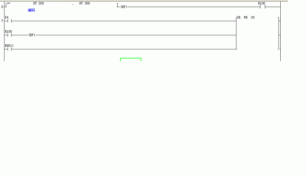 程序如圖,DT200為編碼器(360P/R)的實(shí)際角度,DT300為動(dòng)作開(kāi)始角度,X4(光電開(kāi)關(guān))是在角度為120-200度的時(shí)間內(nèi)的檢測(cè)信號(hào)。